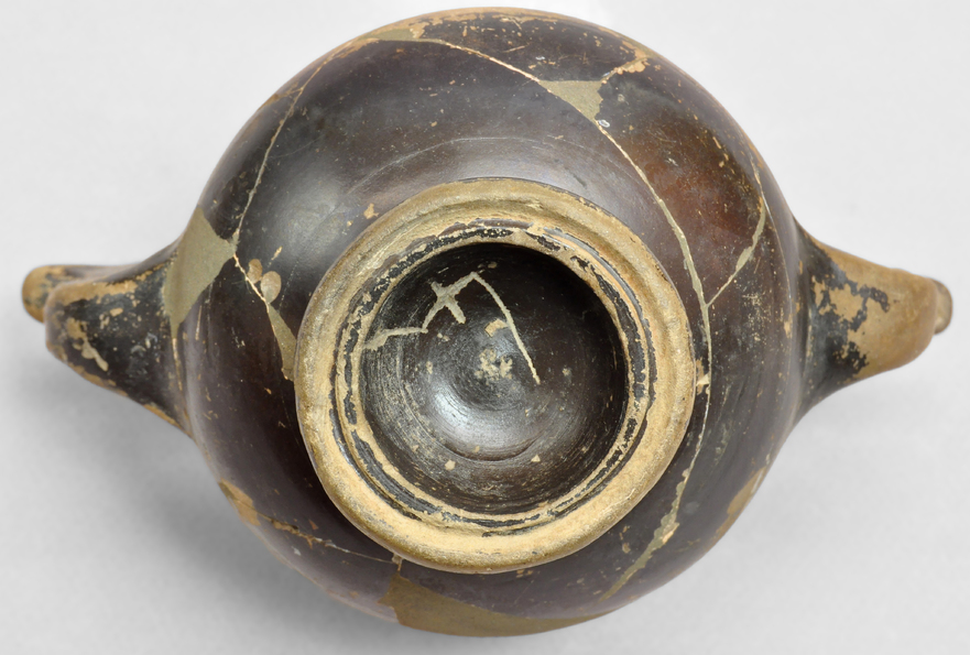 Cántaros ático de barniz negro y borde moldurado. El barniz, de buena calidad, presenta una coloración anaranjada en algunas zonas fruto de una cocción defectuosa. Presenta cuerpo liso y un grafito inciso en el fondo externo identificado bien como una i del signario meridional o bien como el signo púnico para la m, como abreviatura de antropónimo. Pieza fragmentada y restaurada.