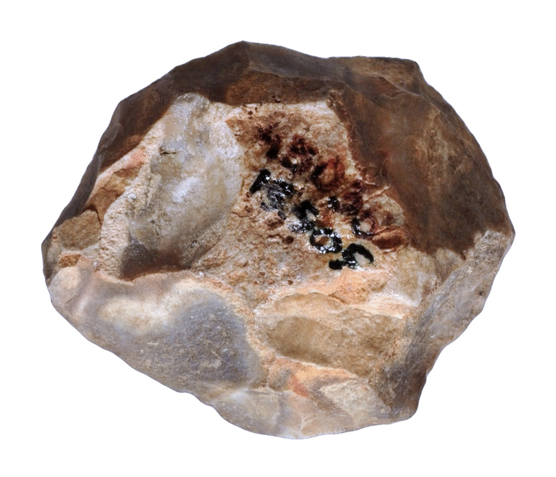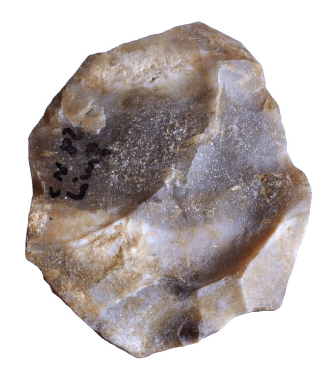 Canto de sílex con numerosas extracciones y planos de preparación, propios de la talla levallois. El núcleo conserva todavía parte de córtex. Sílex color gris con vetas blancas.