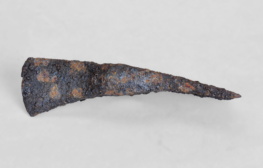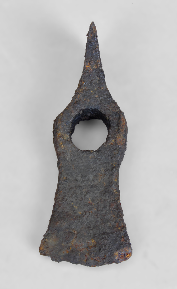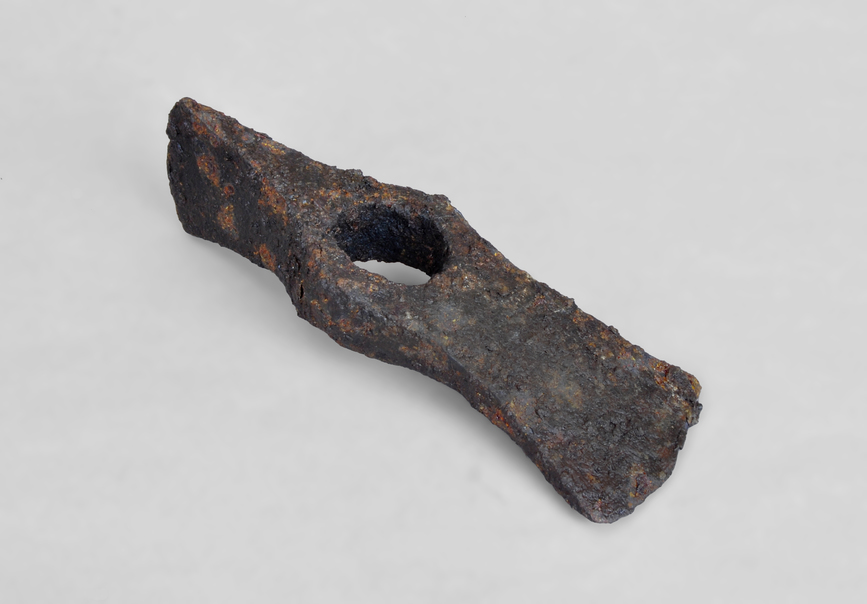 Picola de ferro amb una forat central per a posar el mànec. El tall de l'aixa està desdentat.