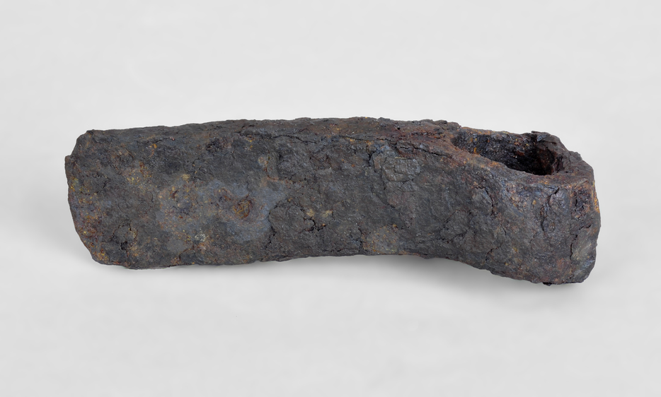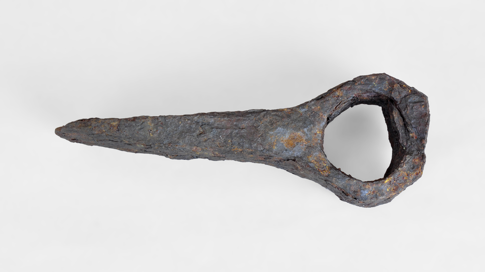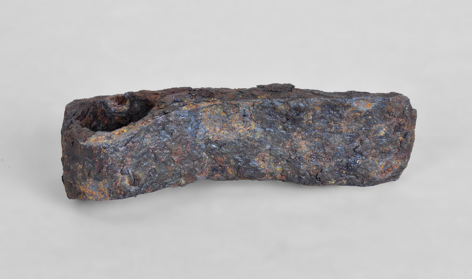Destral de ferro amb fulla estreta i allargada i ull ample per al mànec.