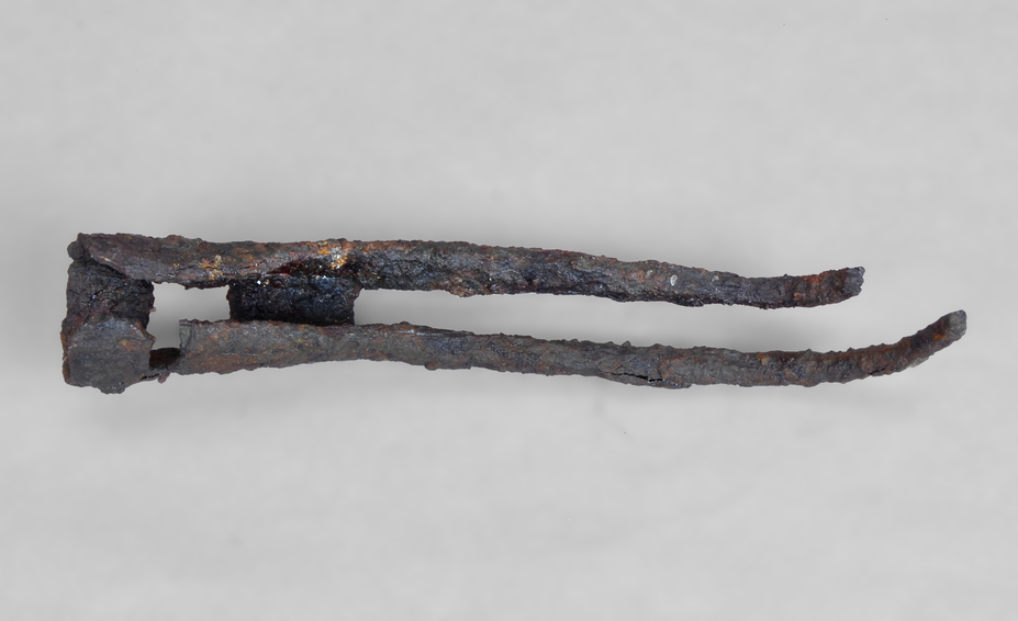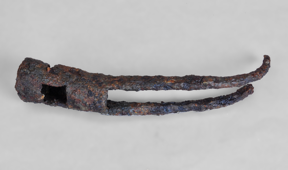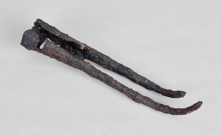 Laya de hierro de dos púas y tubo para el mango con perforación cuadrangular. Las púas están ligeramente dobladas.