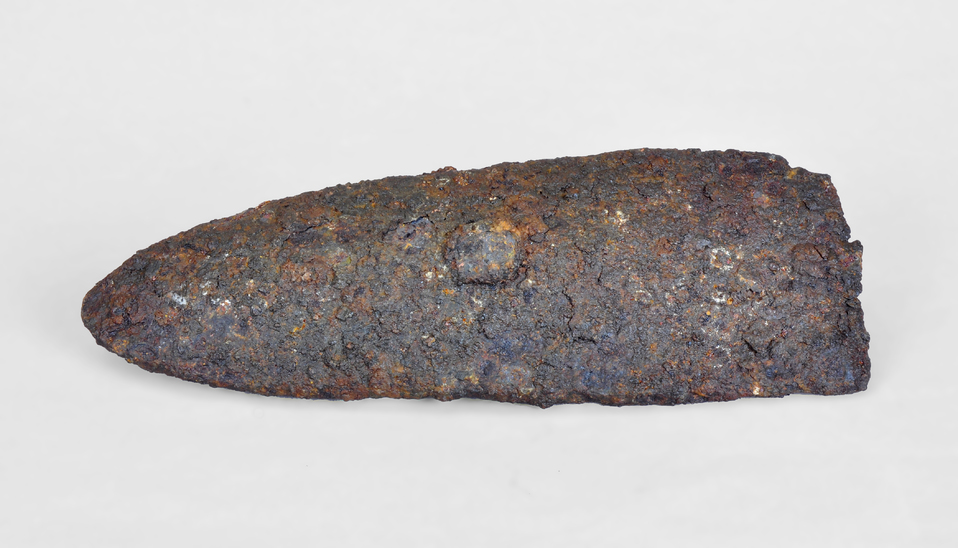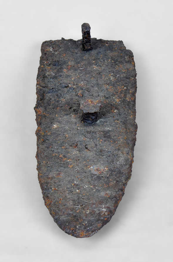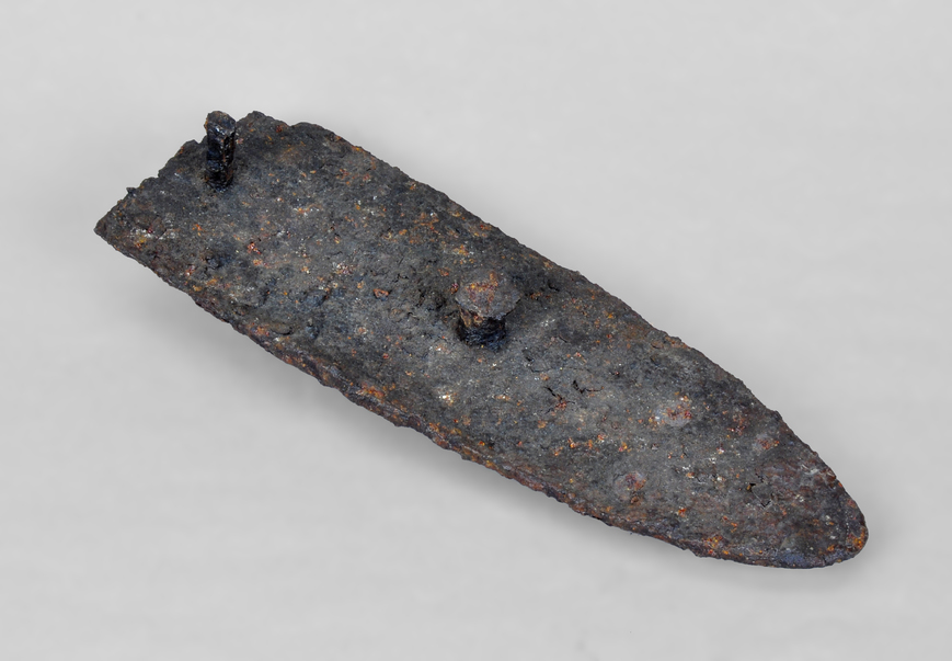 Rella d'aladre de perfil quasi rectangular amb un extrem apuntat en ogiva i de secció planoconvexa. Té dos reblons de subjecció dental.