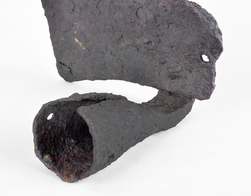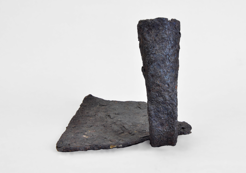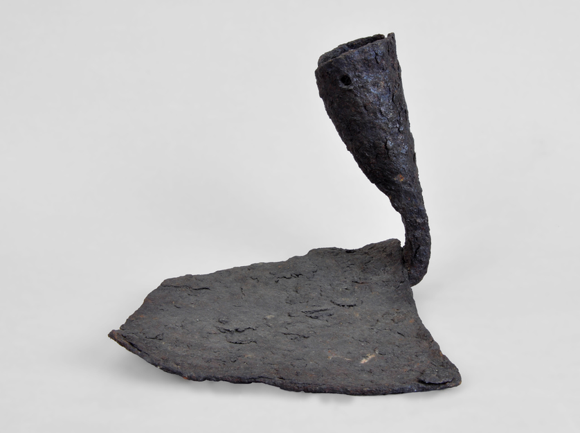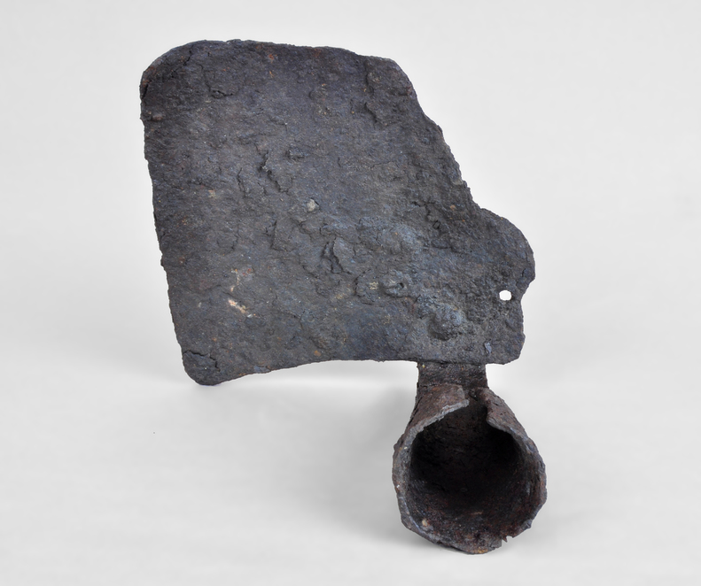 Legón de hierro, cuya pala se une al tubo de enmangue mediante un remache. El tubo tiene dos perforaciones para fijar el mango de madera. La mitad de la pala del legón está fragmentada.