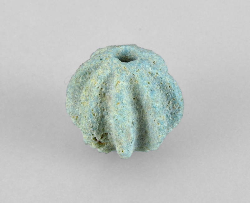 de pasta vítria i cos esfèric gallonat. És de color blau clar.