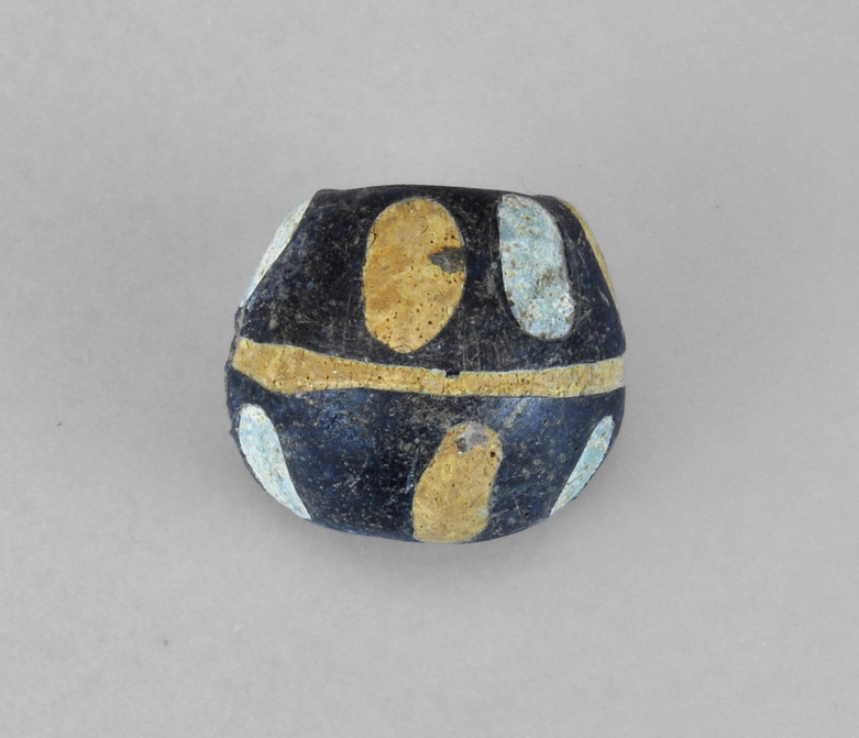 Dena de pasta vítria esfèrica i de superfície llisa de color blau. Una línia groga en el centre divideix dues meitats decorades amb sèries d'ovals grocs i blancs. Es conserva la meitat de la peça.