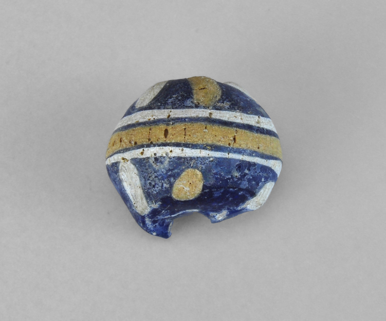 Dena de pasta vítria esfèrica amb superfície llisa de color blau. Una banda groga i dues línies blanques divideixen dues meitats decorades amb sèries d'ovals grocs i blancs. Es conserva la meitat de la peça.