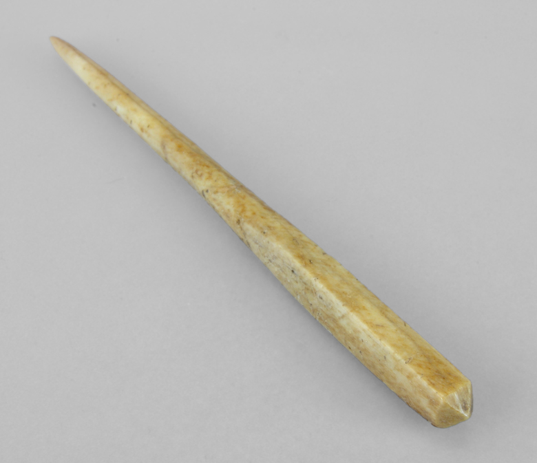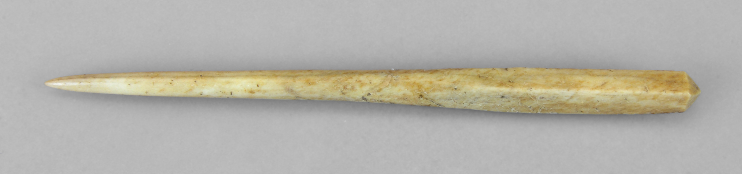 Agulla d'os. És una eina allargada i apuntada de secció circular fins a la part mesial i quadrada en la proximal. El cap està rematat amb un acabat piramidal.