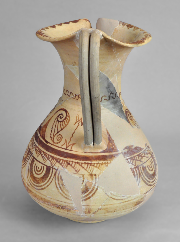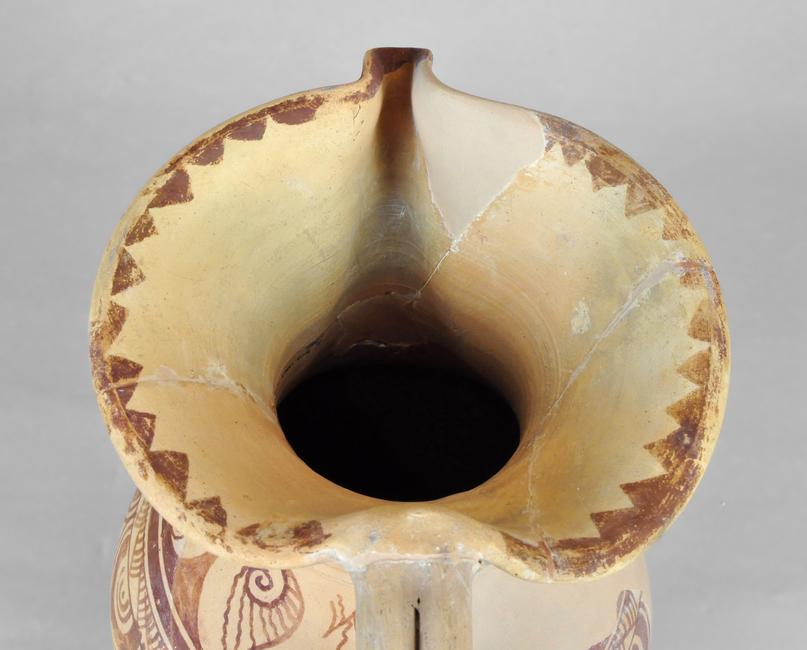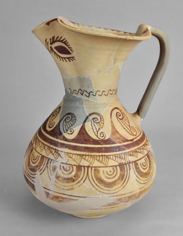 Jarra de boca trilobulada, asa de doble nervadura y cuerpo bicónico. Decoración pintada con dos ojos con pestañas situados a cada lado del pico vertedor, ondas en el cuello con semicírculos, segmentos y volutas en el cuerpo. La pieza está fragmentada y restaurada. Algunos fragmentos están quemados.