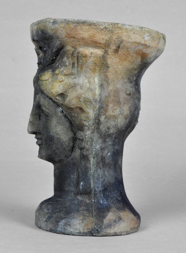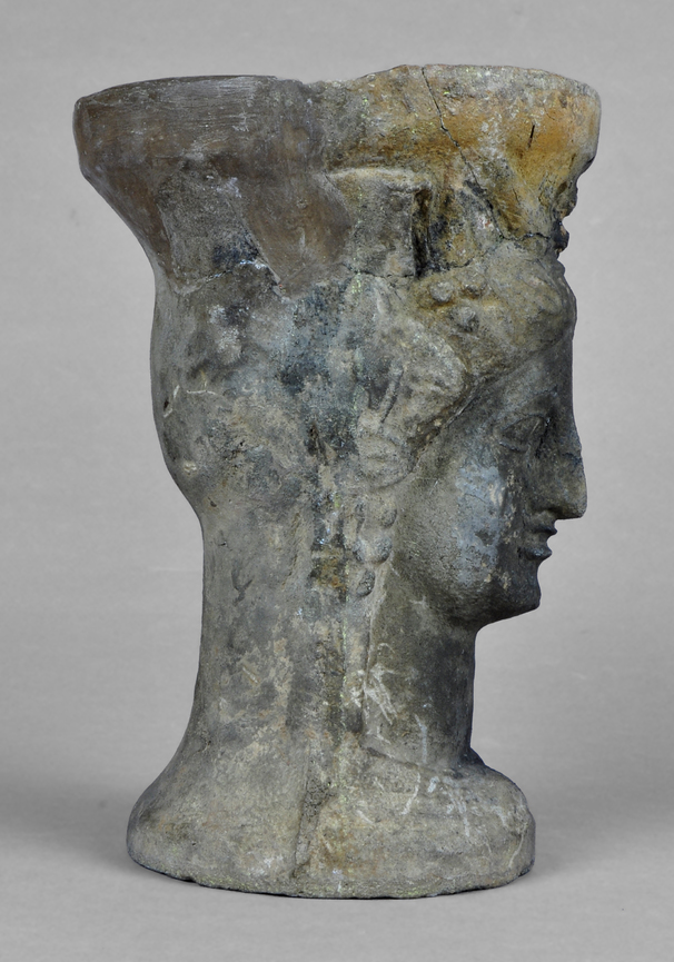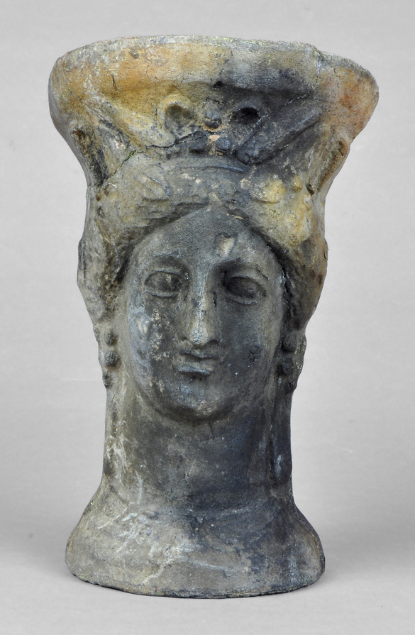 Peveter o cremaperfums amb forma de cap femení, amb kalathos incomplet, restes d'engalba blanca i policromia. Cabellera dividida en dos per una ratlla al mig, una mica arreplegada cap arrere i amb fulles i fruits. Sobre el front porta una cinta o xicoteta diadema que arreplega els cabells i, damunt, el tema principal, està format per un grup de tres fruits en què hi ha dues aus enfrontades. Fragmentat i restaurat.