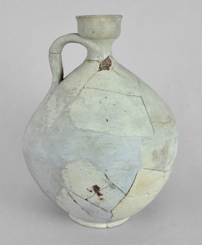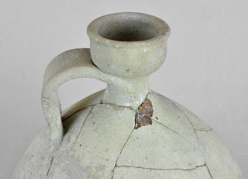 Gerra púnica, probablement de producció ebusitana. Cos globular, coll estret i ansa amb secció de cinta. En la superfície del cos té dues empremtes de ferro. La peça està fragmentada i restaurada.