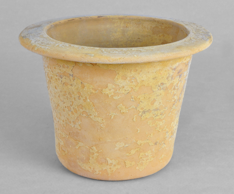 Cálato de cuerpo troncocónico y borde plano ligeramente pendiente. Decoración pintada, muy perdida, de círculos concéntricos.