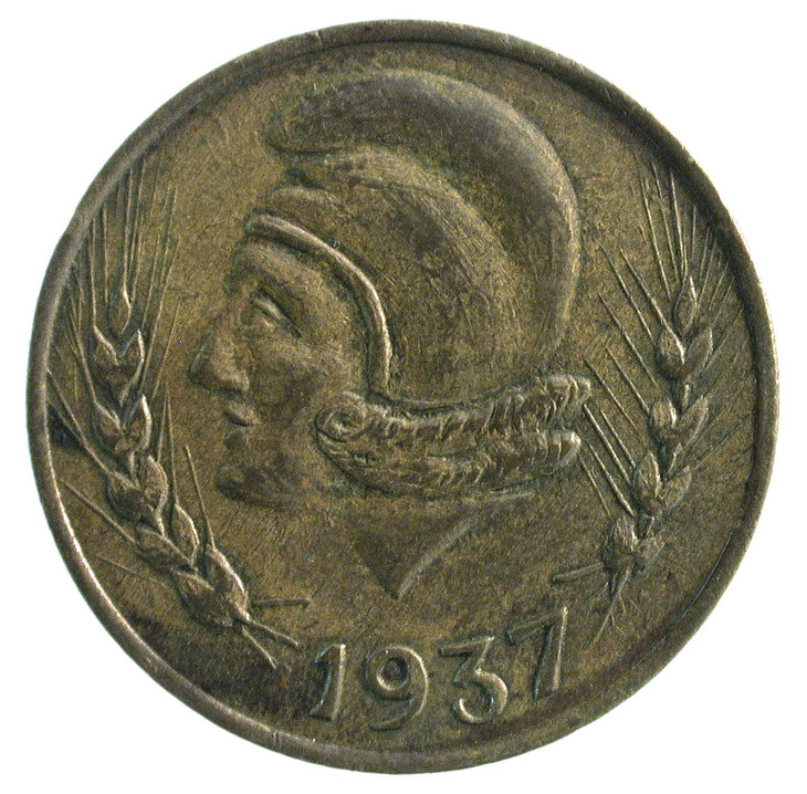 Cap al·legòric de la República, amb capell frigi, a esq., entre dues espigues de blat.