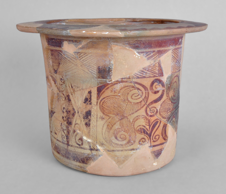 Cálato cilíndrico y de ala plana. Decoración pintada de motivos vegetales compuesta de una cenefa superior con serie de rectángulos con triángulos concéntricos y otra inferior con dos metopas con hojas de hiedra, roleos y rellenos de zapateros y estrellas, separadas por columnas con temas geométricos con eses y líneas onduladas. En el ala hay dos series de dientes de lobo y, en el centro, línea de eses. Hay partes quemadas. Pieza fragmentada y restaurada.