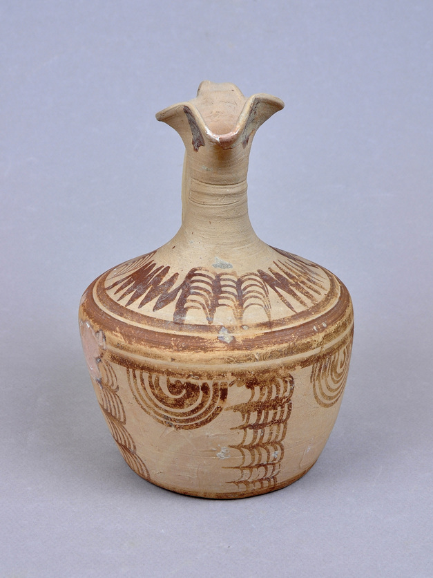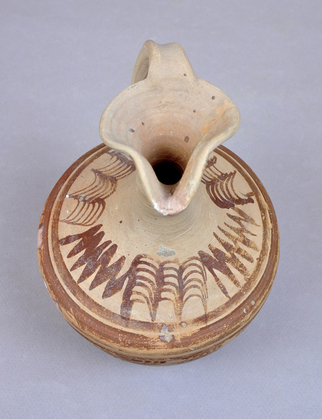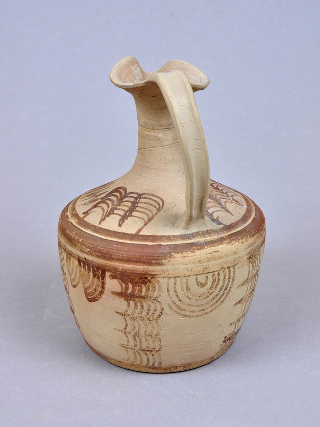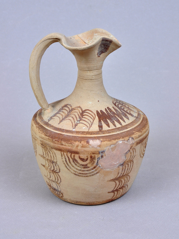 Pitxer de ceràmica. Cos en con invertit i coll estret, boca trilobulada i ansa en cinta. Decoració pintada amb una franja entre filets, sobre la qual hi ha una sanefa de línies en zig-zag que alternen amb teules i, més avall, sèries de bucles que alternen amb semicircumferències concèntriques. En la vora de la base hi ha un filet i a ambdues bandes del bec traços rectangulars. Hi ha esguits de pintura en la part interior de la boca. La peça està fragmentada i restaurada.