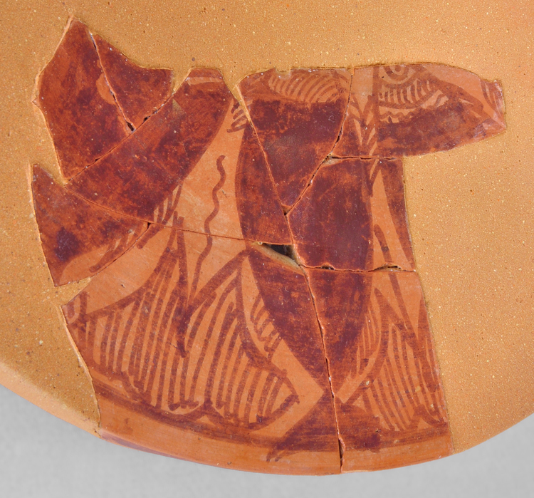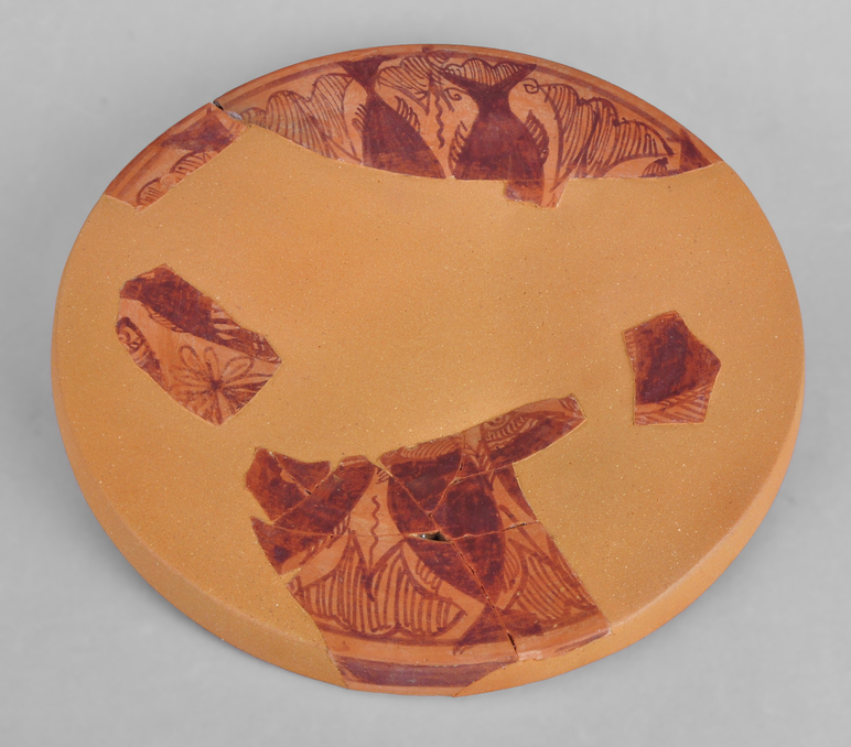 Plato de borde pendiente. Decoración pintada, en la cara interna, con serie de peces situados radialmente con las cabezas hacia el centro. Como motivos de relleno hay hojas trilobuladas y rosetas. En el exterior decoración de serie de flores, filetes y roleos. Falta la base. La pieza se ha reconstruido a partir de los fragmentos conservados.