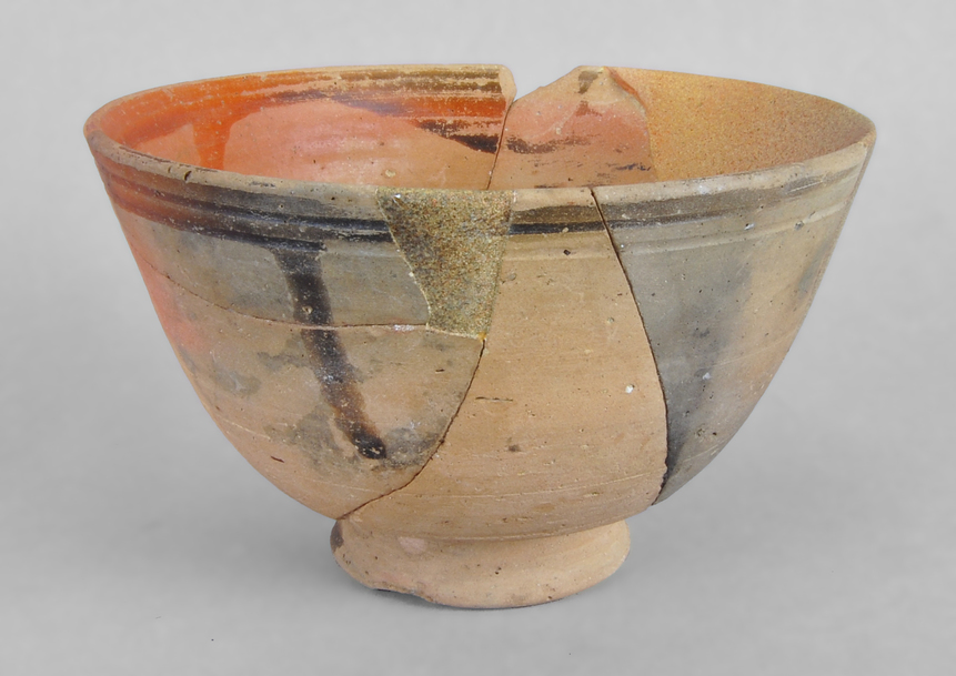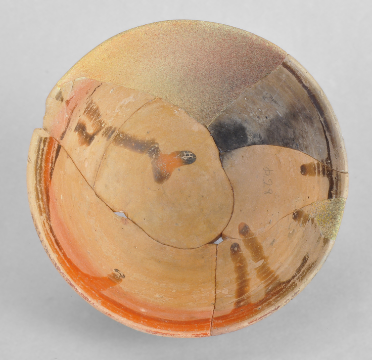 Cuenco de cerámica púnica ebusitana. Tiene engobe muy heterogéneo de tonalidades diversas, del marrón oscuro al naranja, que se aplica de forma irregular en el borde, tanto al interior como al exterior y que ha dejado manchas en la parte interior y exterior. Pieza fragmentada y restaurada.