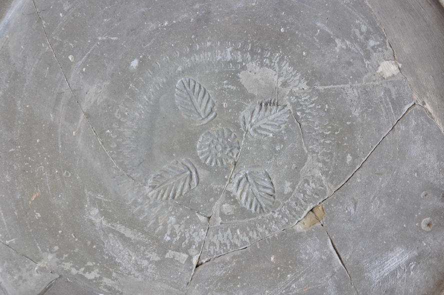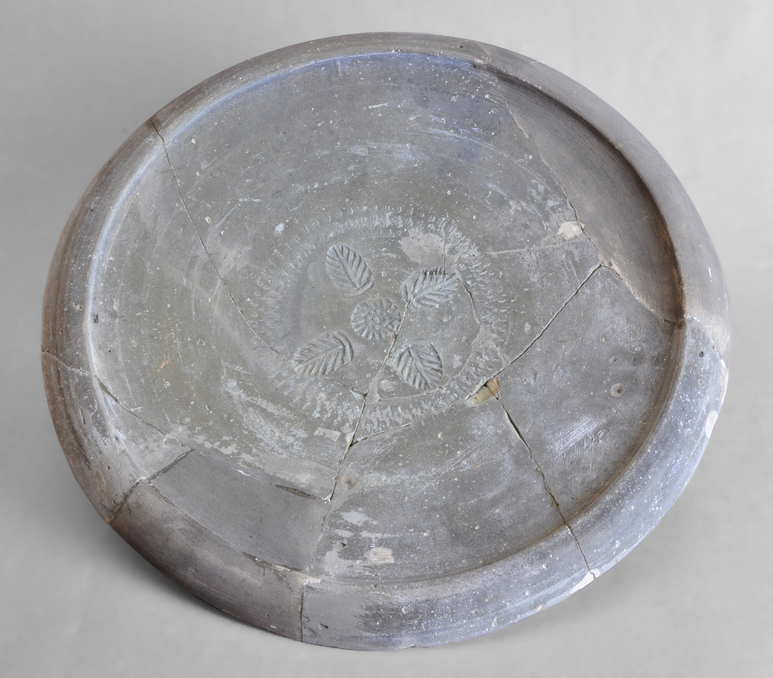 Plato de producción púnica ebusitana de pasta gris. Presenta un engobe gris oscuro muy perdido en la cara externa. En el fondo interno hay una decoración compuesta por una roseta central, rodeada por cuatro palmetas impresas en disposición simétrica y cuatro líneas de ruedecilla. Pieza fragmentada y restaurada.