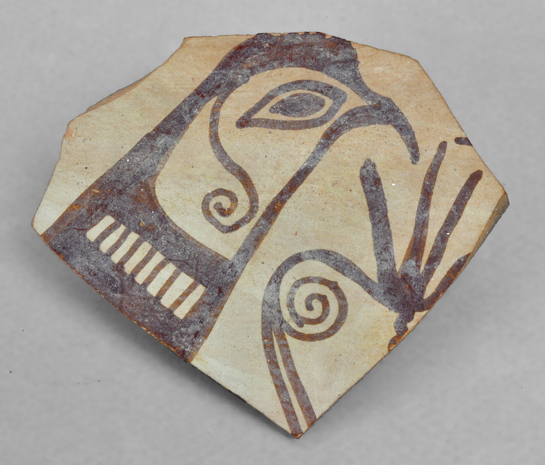 Fragmento de cerámica perteneciente a una gran vasija de forma indeterminada. Decoración pintada con la cabeza de un ave de pico curvado, ojo almendrado y cuello silueteado con una especie de banda de tres trazos verticales en el cuello. Frente al ave hay una flor parcialmente conservada.