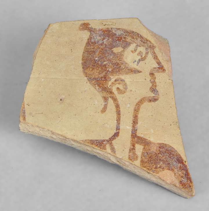 Fragmento de cerámica perteneciente a una gran vasija de forma indeterminada. Decoración pintada con el torso y cabeza de un personaje masculino con casco rematado en un pomo elevado.