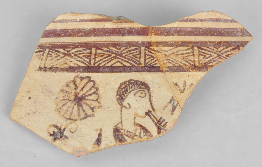 Dos fragmentos que unen un recipiente cerámico de tipo indeterminado. Decoración pintada con filete, banda y cenefa dividida en rectángulos decorados con series opuestas de ángulos inscritos. Por debajo, el busto de un personaje que toca la flauta doble. Roseta y un motivo geométrico en el relleno.