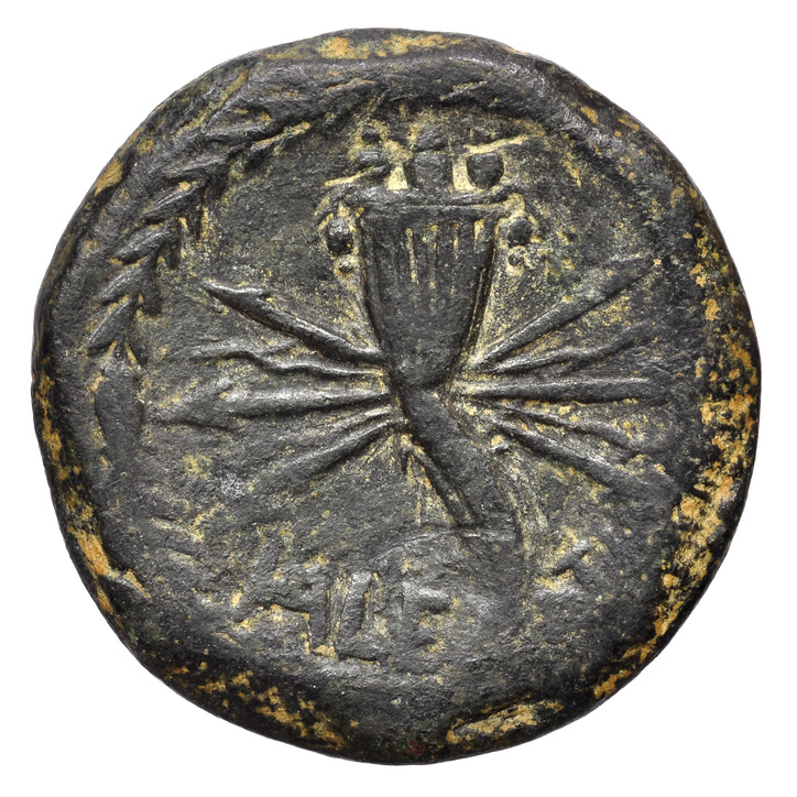 R/ Cornucòpia sobre feix de lamps dins d'una corona, llegenda