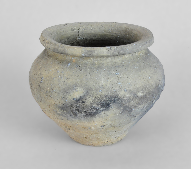 Olla de borde saliente y base cóncava. Superficies quemadas en la parte central.