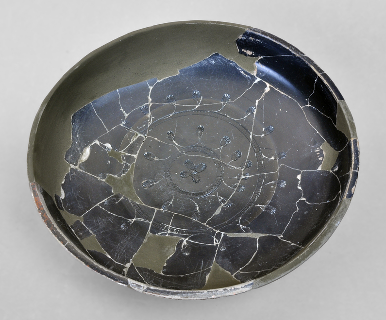 Cuenco ático de barniz negro. En el fondo interno presenta una decoración de palmetas combinadas con un primer círculo exterior compuesto por dieciocho palmetas enlazadas, un círculo de ovas, otro círculo de doce palmetas enlazadas, un nuevo círculo de ovas y finalmente cuatro palmetas simétricas unidas por un círculo inciso. En el exterior encontramos una banda en reserva bajo el labio y una alternancia de círculos barnizados y en reserva en el fondo externo. La pieza está fragmentada y restaurada.