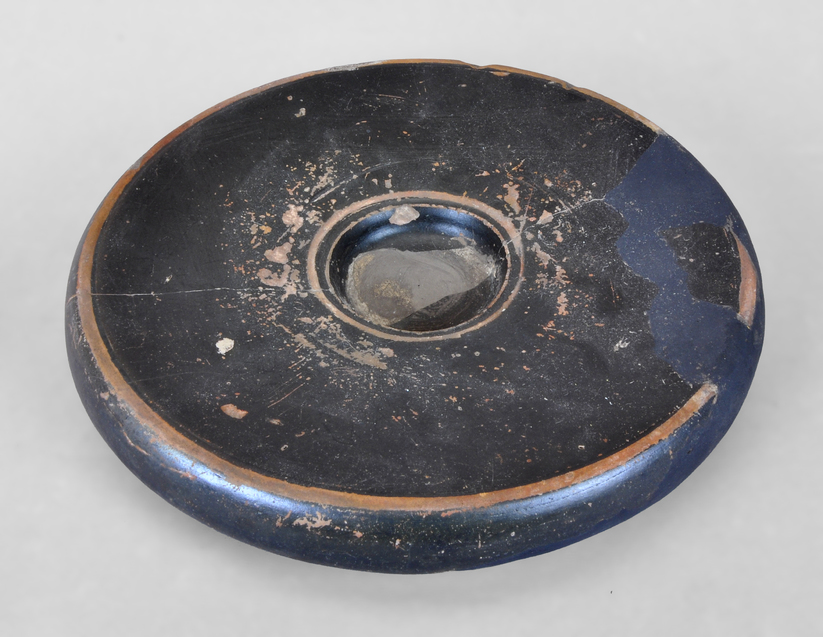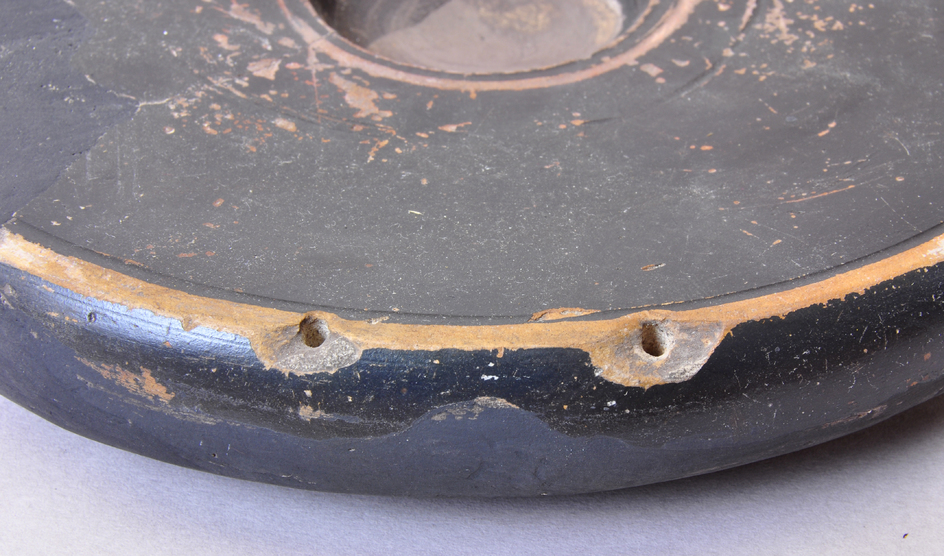 Plato de pescado ático con barniz negro muy brillante. Presenta un pocillo central y borde pendiente, muy ancho. Tiene bandas en reserva alrededor de la parte central, la zona superior del borde y el pie. En el borde hay dos agujeros de suspensión realizados después de la cocción. Pieza fragmentada y restaurada.