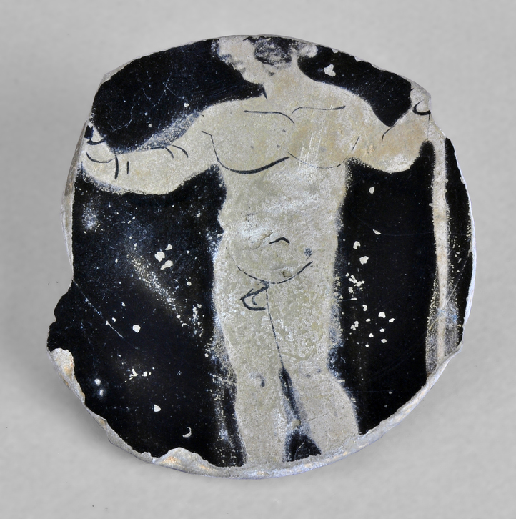 Tejuelo recortado sobre un fondo de copa ática de figuras rojas. El recorte ha respetado la imagen de un individuo masculino desnudo con una especie de bastón en su mano izquierda, que estaría en la cara interna de la copa original. La otra cara, correspondiente al fondo externo de la pieza original, presenta una alternancia de círculos barnizados y en reserva, alrededor de un punto central.