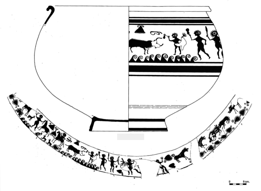 Lebeta de pie alto y borde moldurado. Decoración pintada en un friso entre bandas en el que se desarrollan cuatro escenas: una escena de caza donde tres lobos acorralan a un jabalí; una segunda escena muestra dos jinetes, uno de ellos desmontado y con un palo en la mano y cuatro perros sentados; otra escena tiene dos personajes masculinos con porras o lazos frente a un toro; finalmente se representa una escena de lucha, fragmentada y perdida en parte, con dos infantes armados con jabalina, falcata y escudos, entre otras figuras incompletas. La pieza está fragmentada y restaurada.