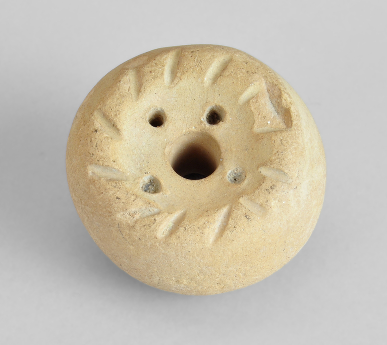 Fusayola esférica. Está decorada, alrededor de la perforación central, con cuatro agujeros equidistantes que no atraviesan toda la pieza y una serie de incisiones oblicuas en el borde superior.