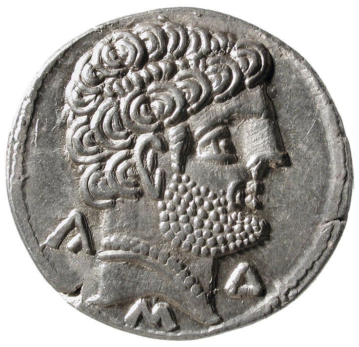 A/ Cap masculí, barbat, amb collar (doble de punt i línia), a dta., llegenda ka-s-tu.