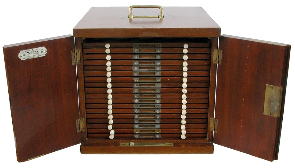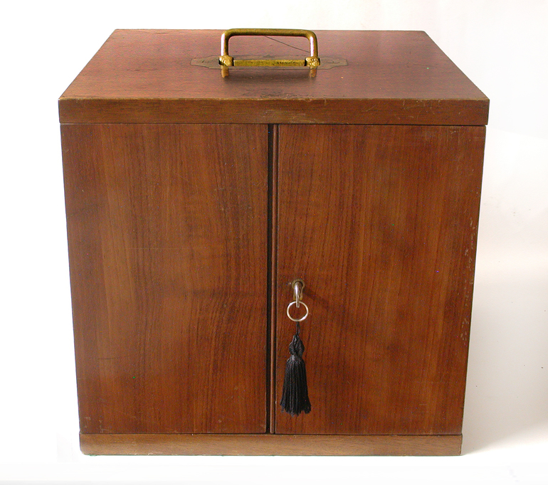 Monetari de de caoba d'origen anglés. Té una doble porta frontal que tanca amb un xicoteta clau. Conserva 18 de les 19 safates que tenia originalment i cadascuna d'elles inclou 20 buits circulars de 32 mm. per a les monedes. Cadascuna de les safates té en el seu front dos tiradors d'os i una placa per a col·locar una etiqueta.