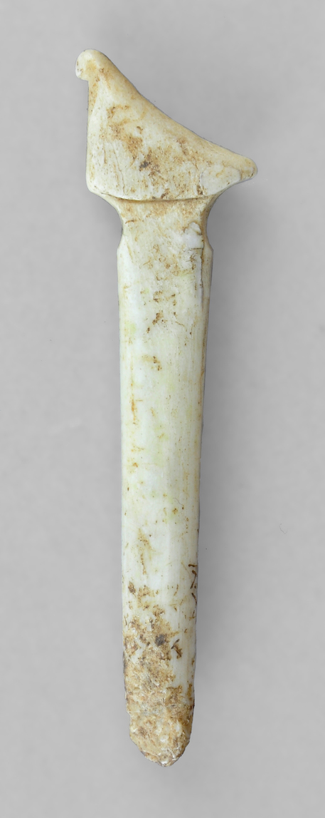 Parte proximal de un alfiler de hueso de cabeza diferenciada, decorada con un ave con las alas plegadas. Pieza fragmentada.