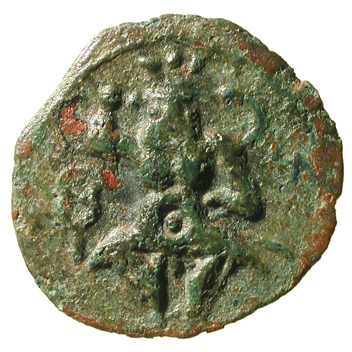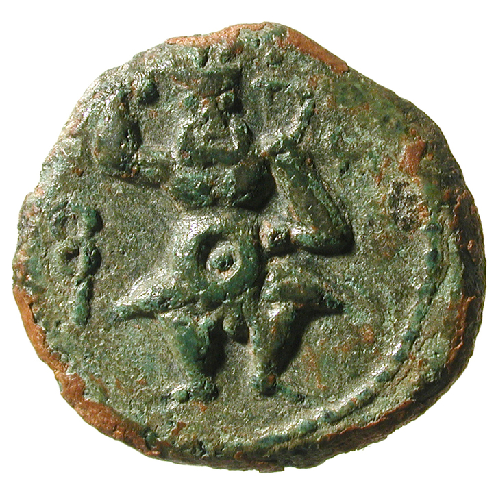 R/ Bes, amb faldellí, sostenint una maça amb la mà dreta i una serp amb l'esq., llegenda shin, marca caduceus.