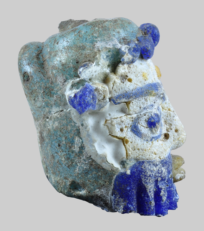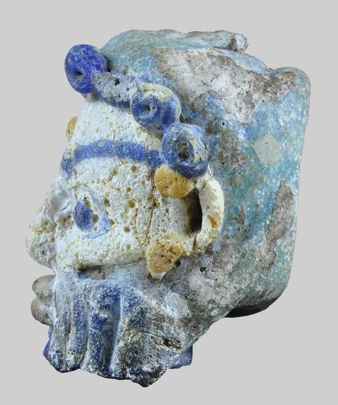 Cap de pasta vítria policroma. Es representa un rostre amb barba i cabell amb nou caragols sobre el front, dos d'ells perduts. El rostre és de color blanc i els cabells i la barba blava. Els ulls, molt desproporcionats, es realitzen amb un cercle i un punt de color blau i, damunt de cadascun d'ells, una llarga cella blava. De color groc es representen dos remats circulars en l'orella esquerra, un cercle situat entre les celles i els llavis, que són prominents.