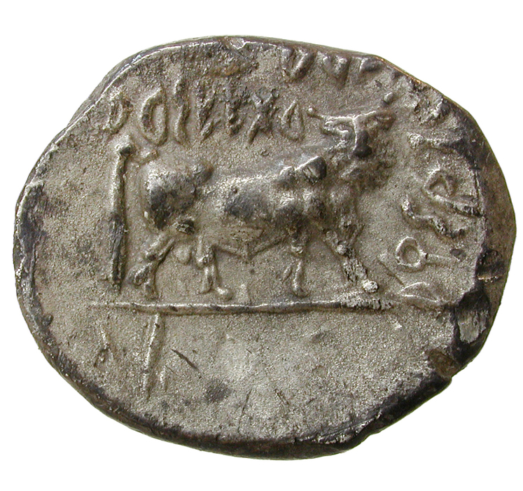 R/ Bou, amb cap humà barbat, marxant, a dta., llegendes arseetar i arsbikisteekiar.