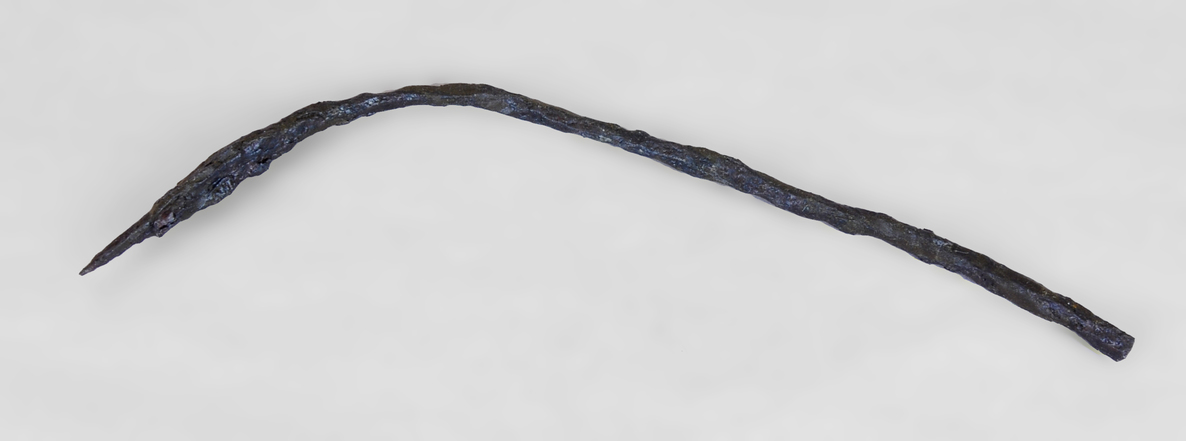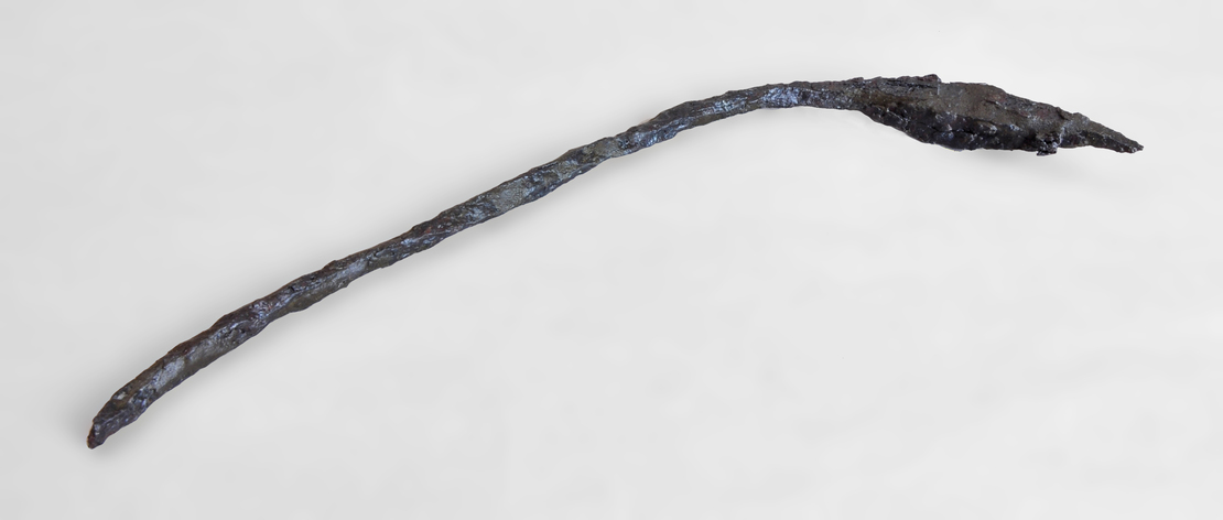 Punta de soliferreum que conserva part de la vareta. L'extrem de la vareta està tallat i la punta doblegada.