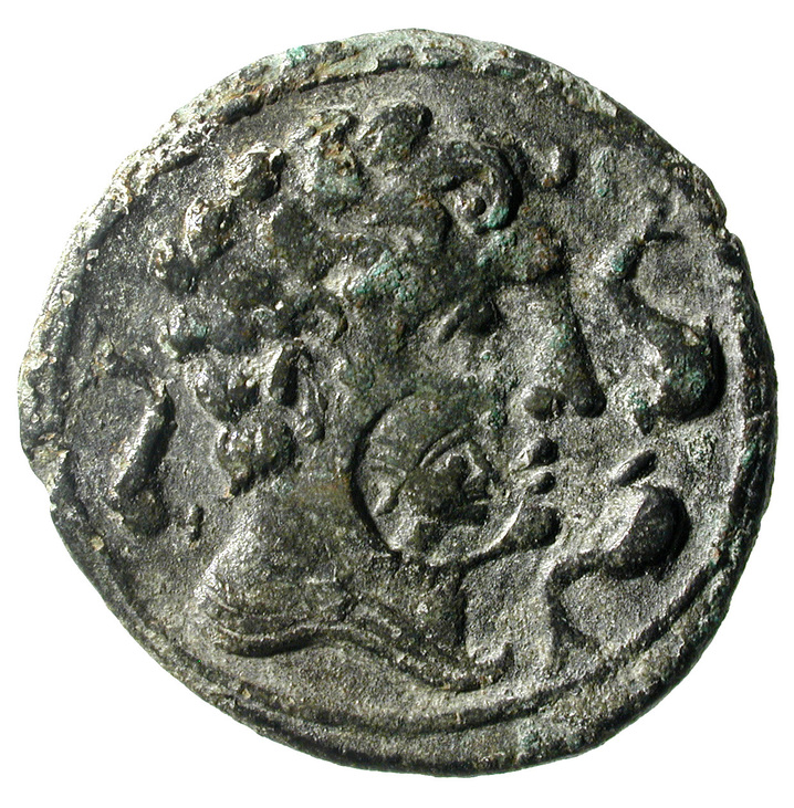 A/ Cap masculí, amb mantell i fíbula anul·lar, a dta., marca tres dofins.