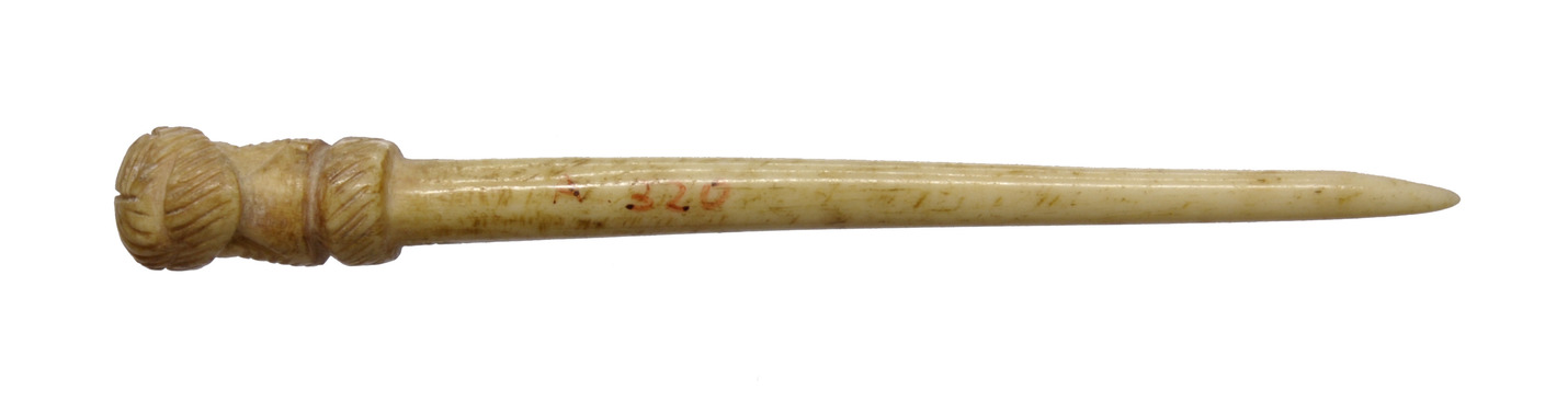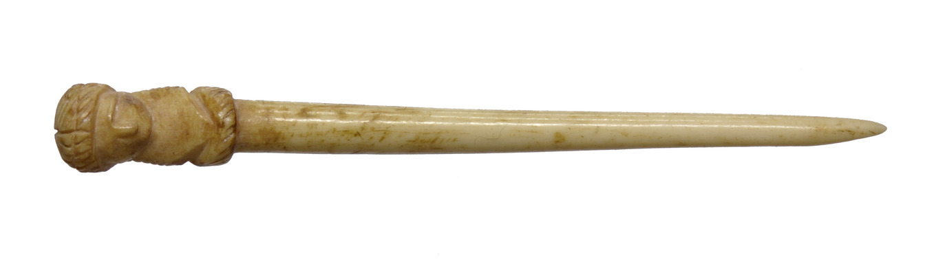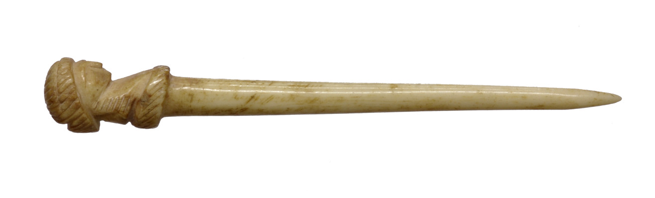 Agulla d'os, decorada en l'extrem superior amb un cap femení esculpit.