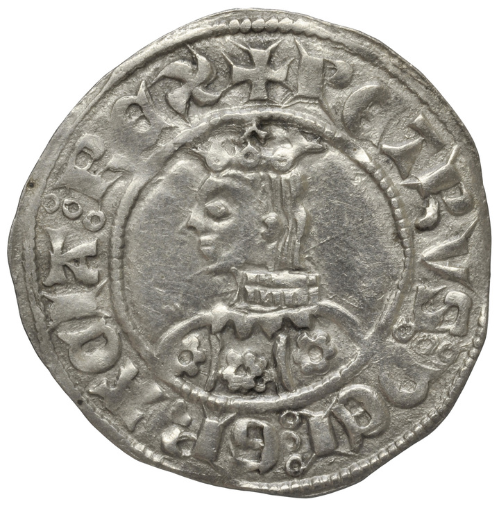 a/ +PETRVS : DEI : GRACIA : REX (A, U i T llatines, separació de tres punts) Bust coronat, a l'esquerra. Vestit partit en tres àrees on hi ha flors de sis pètals. Cabell fluent.