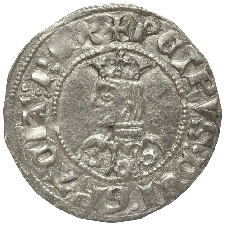 a/ +PETRVS : DEI : GRACIA : REX (A, U i T llatines, separació de tres punts) Bust coronat, a l'esquerra. Vestit partit en tres àrees on hi ha flors de sis pètals. Cabell fluent.