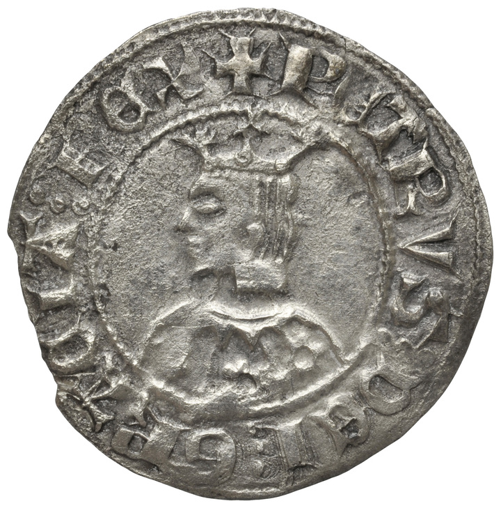 a/ +PETRVS : DEI : GRACIA : REX (A, U i T llatines, separació de tres punts) Bust coronat, a l'esquerra. Vestit partit en tres àrees on hi ha flors de sis pètals. Cabell fluent.