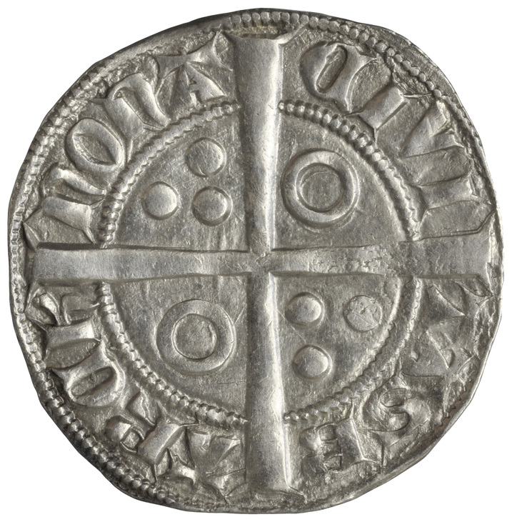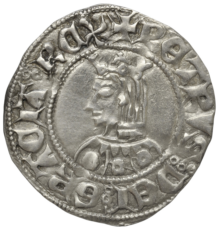 a/ +PETRVS : DEI : GRACIA : REX (A, U i T llatines, separació de tres punts) Bust coronat, a l'esquerra. Vestit partit en tres àrees on hi ha flors de sis pètals. Cabell fluent.