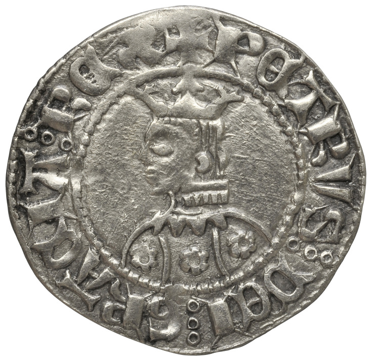 a/ +PETRVS : DEI : GRACIA : REX (A, U i T llatines, separació de tres punts) Bust coronat, a l'esquerra. Vestit partit en tres àrees on hi ha flors de sis pètals. Cabell fluent.