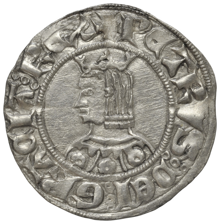 a/ +PETRVS : DEI : GRACIA : REX (A, U i T llatines, separació de tres punts) Bust coronat, a l'esquerra. Vestit partit en tres àrees on hi ha flors de sis pètals. Cabell fluent.