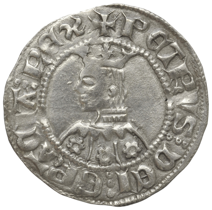 a/ +PETRVS : DEI : GRACIA : REX (A, U i T llatines, separació de tres punts) Bust coronat, a l'esquerra. Vestit partit en tres àrees on hi ha flors de sis pètals. Cabell fluent.