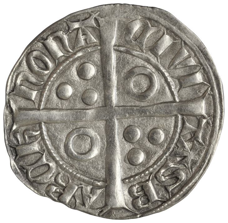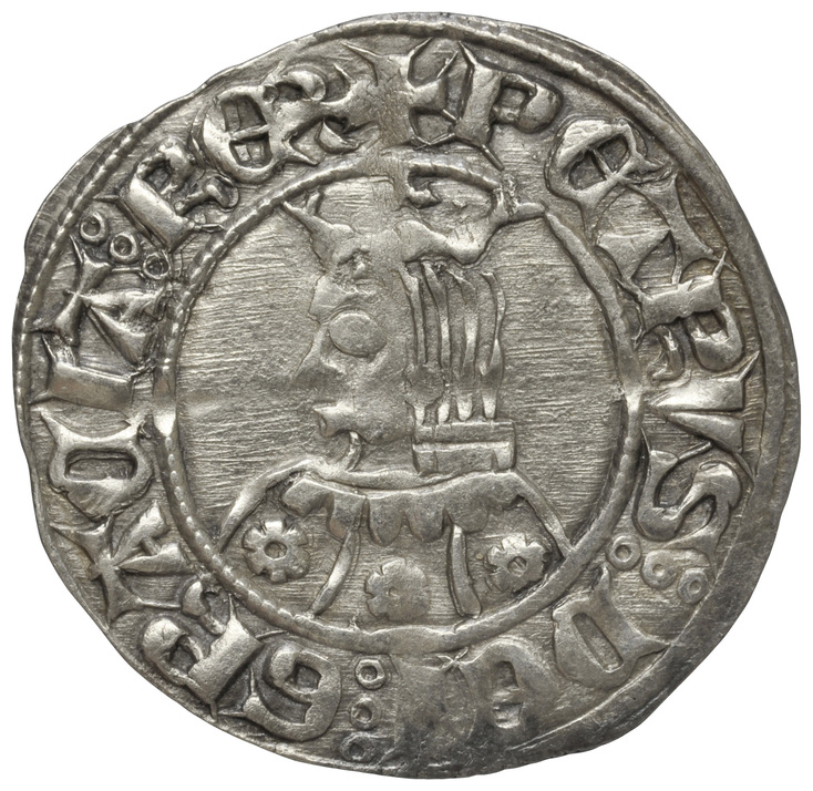 a/ +PETRVS : DEI : GRACIA : REX (A, U i T llatines, separació de tres punts) Bust coronat, a l'esquerra. Vestit partit en tres àrees on hi ha flors de sis pètals. Cabell fluent.
