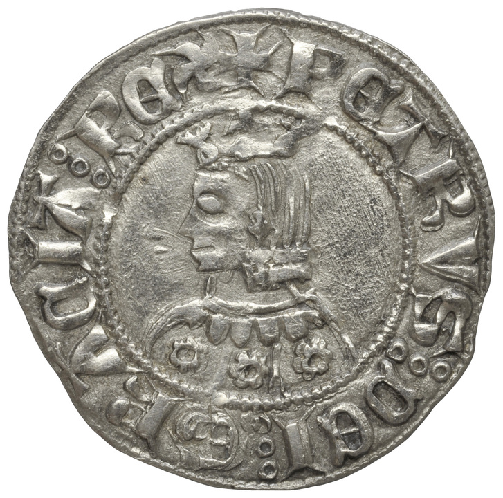 a/ +PETRVS : DEI : GRACIA : REX (A, U i T llatines, separació de tres punts) Bust coronat, a l'esquerra. Vestit partit en tres àrees on hi ha flors de sis pètals. Cabell fluent.