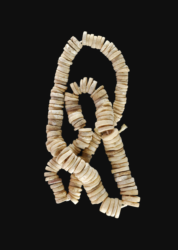 Conjunto de 190 cuentas de collar discoidales de perforación bicónica. Elaboradas sobre piedra calcárea de color blanquinoso.